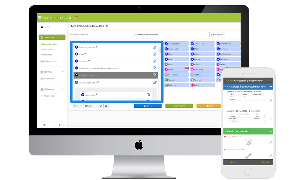 Kizeo Forms est une solution web couplée à une application mobile pour digitaliser tout type d’interventions terrain, processus et documents. Comme son nom l’indique, il est principalement utilisé pour la gestion des “formulaires” c’est à dire de la transmission d’informations entre les équipes ou avec les clients.